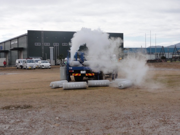①LPガス配送中のトラックが地震に遭遇し、バランスを失いLPガス容器が転落・散乱し、容器バルブの破損によりガスが漏洩したため、運転者が緊急応援を福井県安全環境部危機対策・防災課に行う。