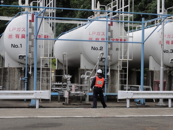 本訓練は2011年3月に発生した東日本大震災の教訓を踏まえ、大規模災害発生時に被災地域に対し、LPガスを安定的に供給できる体制を構築することを目的とし、国の補助を受けて福井県内7ヶ所で整備を進め、災害時を想定して行う中核充填所の訓練です。