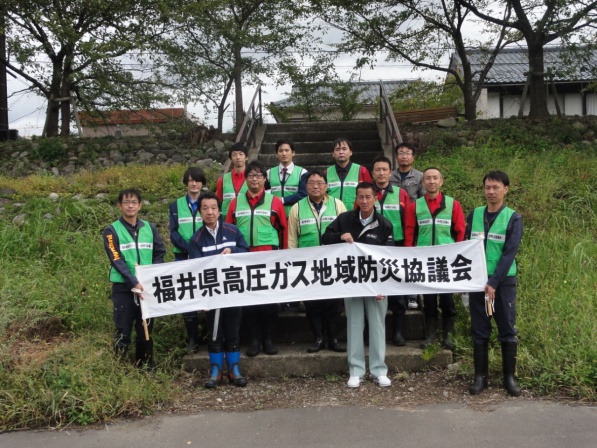④要請により現場に急行した、福井県防災会職員が現場への立ち入り区域設定を行い、付近住民への広報活動にあたるとともに、同じく要請により現場に急行した、福井県地防協の防災応援要員が防災工具によりガス漏洩修繕処置を実施し、ガス漏れ検知器による安全確認後、散乱した容器の回収を行う。